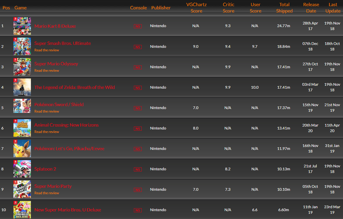 根据VGChartz上所显示主机游戏销量数据,在Switch平台销售榜上,销量前十名游戏均被任天堂一家所霸占。而更为“离谱”的是,任天堂这个“屠榜”一直持续到第十九名才被育碧的《马里奥+疯狂兔子:王国之战》所终结。