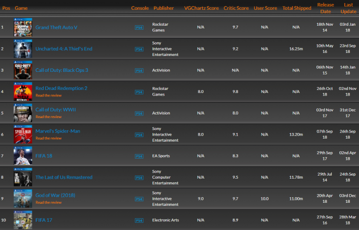 作为对比,索尼公司的PS4平台销量榜显得“和谐”许多。