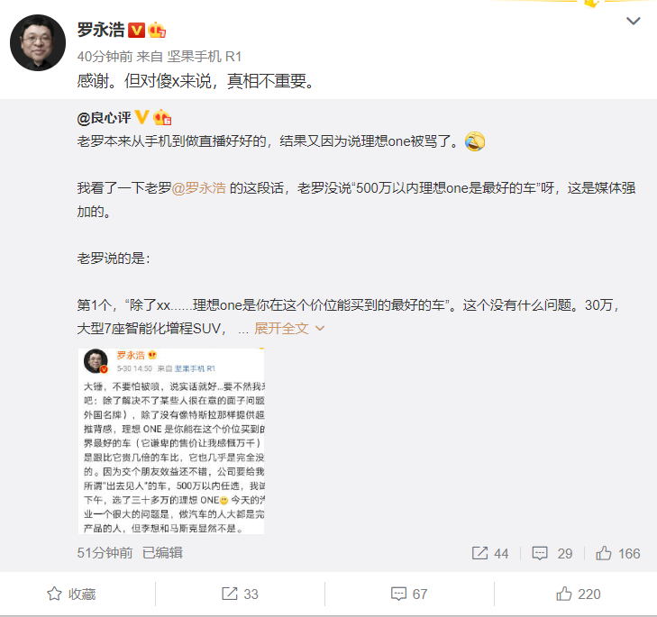 第3个,老罗说的是“公司给他预算500万任选,他选了一个30万的理想”,这是他自己的选择,并没有说500万以内理想one就是最好的车。这完全是媒体篡改的啊。