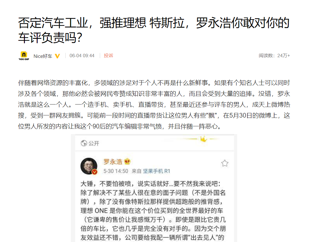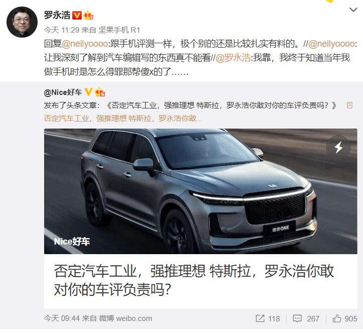 此言一出,立刻引发争议,有90后汽车编辑发文《否定汽车工业,强推理想 特斯拉,罗永浩你敢对你的车评负责吗?》怒批罗永浩。