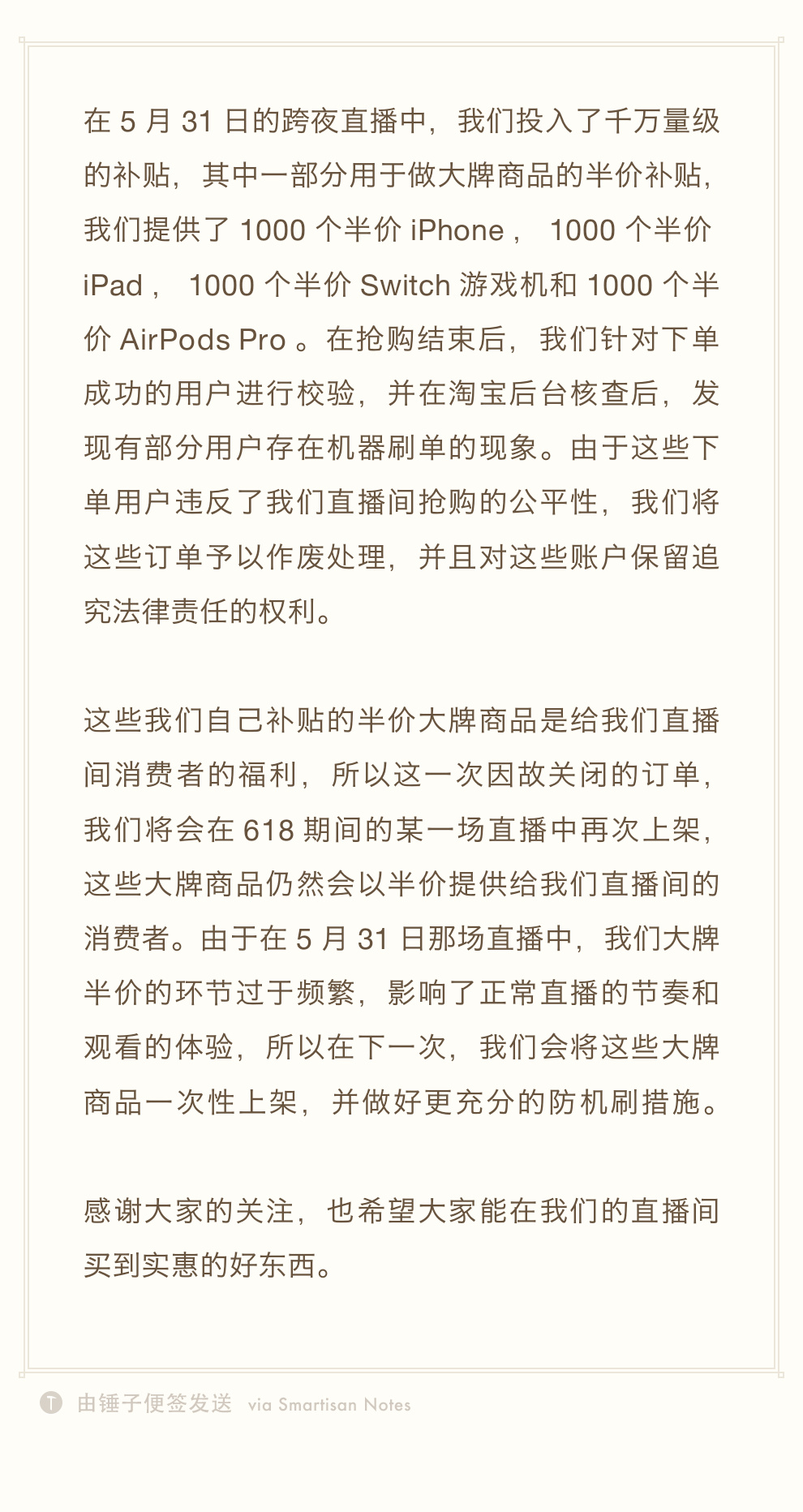 这部分订单作废后留下的产品,罗永浩将在618期间的直播中再次上架销售。
