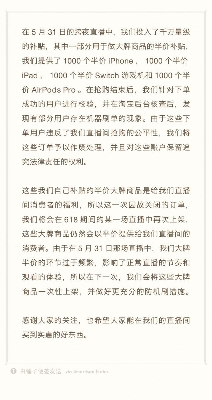 据爆料,这些半价产品之所以“秒没”是因为有人在罗永浩直播间使用软件不断刷新并自动下单购买,因此导致普通用户还没打开页面就已经售罄。针对这一问题,交个朋友官方发布了处理声明,声称淘宝在后台审核时已经发现了部分用户存在机器刷单的情况,并将这些订单予以作废处理。