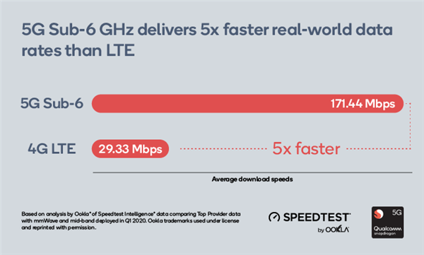 近期在欧洲和美国的实测数据显示,5G尤其是毫米波,能在实际使用环境中带来更高速的连接体验。根据权威的Ookla Speedtest中的用户实测数据,在英国,搭载高通骁龙移动平台的终端的平均5G下载速率为171.44Mbps,相比于4G LTE 29.33Mbps快了足足5倍。