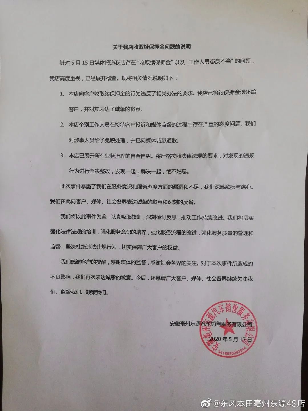 今年5月17日,安徽亳州东风本田4S店因“续保押金”登上微博热搜。报道称,安徽亳州东风本田4S店向车主收取1000元续保押金,车主不愿再在店里继续续保,4S不肯退还押金。