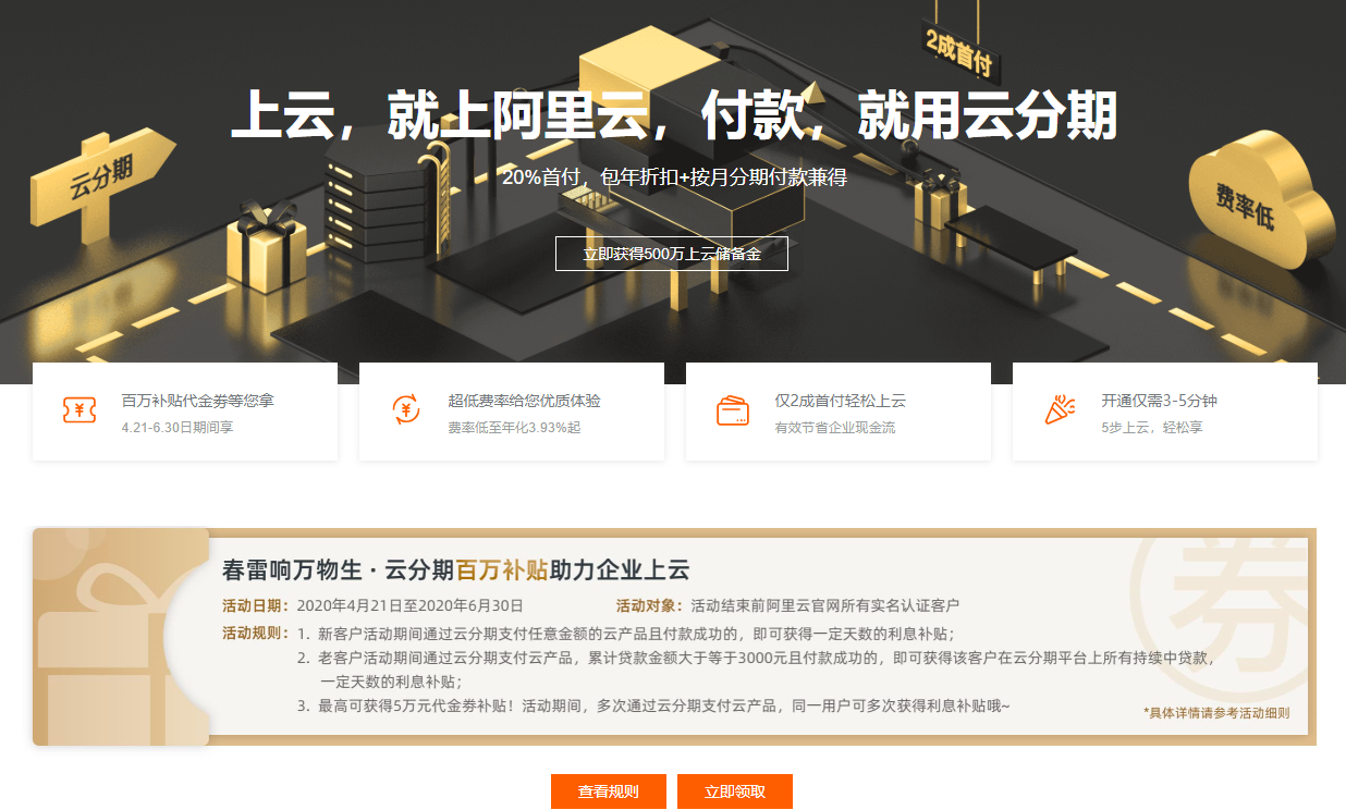云分期发放百万补贴助力企业上云,费率超低,首付仅2成,轻松上云。