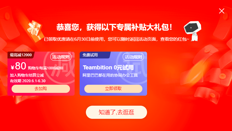 除了满减礼包,有可能还会有意外豪礼奥,小编还领到了Teambition的免费试用权益。