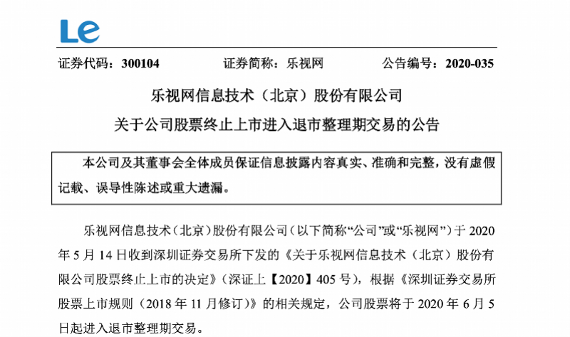 5月14日乐视网发布公告称,公司于2020年5月14日收到深圳证券交易所关于公司股票终止上市的决定,自深圳证券交易所作出公司股票终止上市的决定后十五个交易日届满的次一交易日(即2020年6月5日)起,公司股票交易进入退市整理期。
