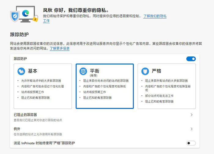 新版Edge中的防追踪等级设定