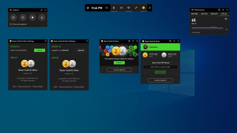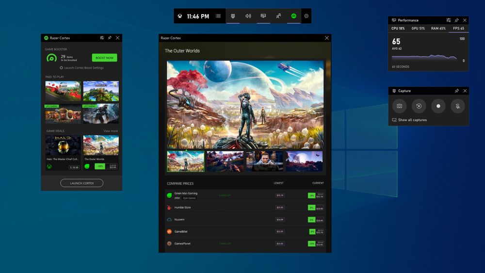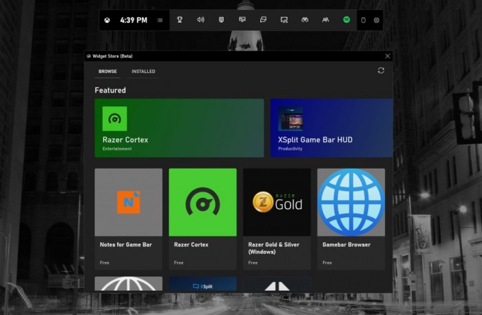 想要访问全新的插件商城,你需要点击游戏栏左侧的 Widget 菜单。目前该商城只提供了 7 个插件,包括 RAZER Cortex 性能优化应用、热门游戏直播应用 XSplit(可替代近期从 Xbox Game Bar 中移除的 Mixer 直播功能)等。