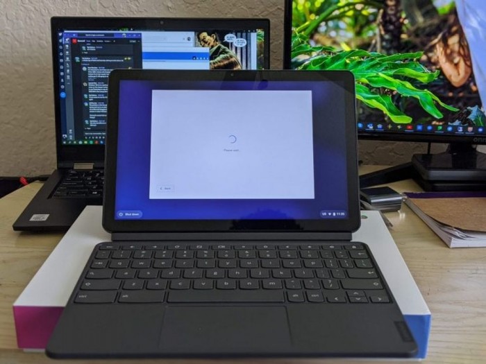 尽管在细节上打磨得有点粗糙,但是 ChromeBook Duet 提供了主流笔记本该有的大部分东西。在开箱之后用户可以获得10英寸的平板电脑和磁性后盖,并且能够像 Surface 一样用支架调整使用角度,此外设备底部还有专有的 pogo 端口来连接键盘。