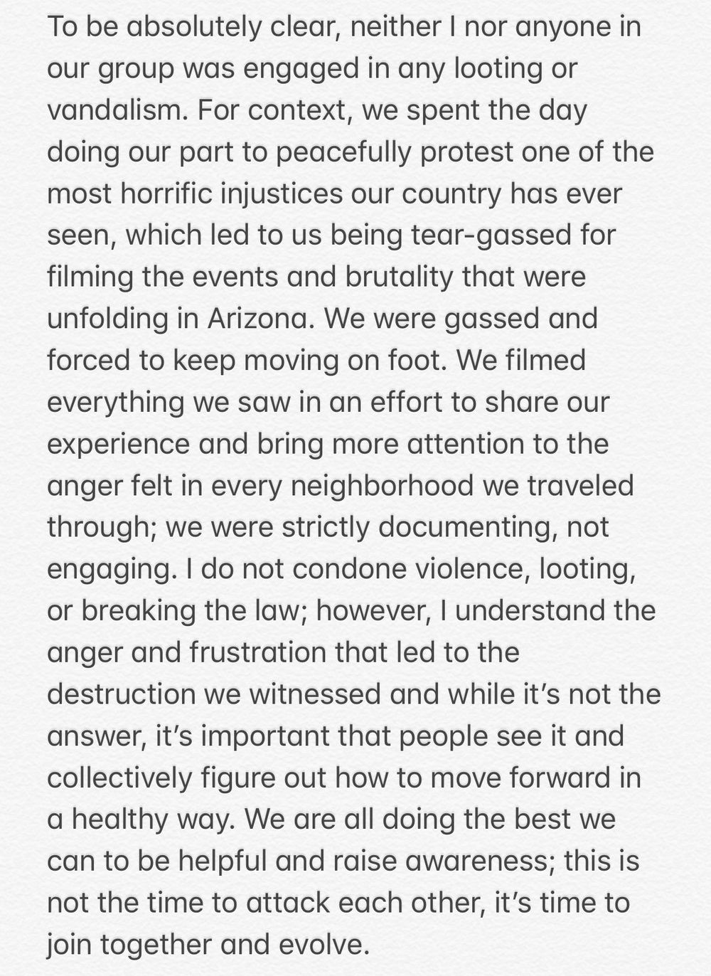 交代一下背景,我们白天一直在和平抗议,为我们国家最近发生的恶劣不公呼喊,在我们拍摄记录亚利桑那州发生的事件和暴行时,我们被催泪弹攻击,被强迫的往前走。我们记录下一切,是为了让大家看到每个社区感受到的愤怒。我们只记录,不参与。我不同情暴力,打劫,和违反法律。但同时,我也理解导致暴力和毁坏的愤怒和失望,但这不是解决问题的答案。重要的是,大家看到问题,并且以健康的方式往前走。