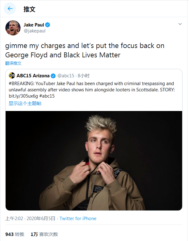 保罗在本周四下午发布推文称:“把指控给我吧。让我们把焦点放回乔治·弗洛伊德和黑人生活质量问题上。”保罗此前否认自己参与了任何抢劫活动。在Instagram和Twitter上发布多段视频后,他在Twitter上发表了一份长篇声明,视频显示他和他的团队成员在亚利桑那州一家商场外和商场内发生了抢劫事件。保罗的声明称,"我和我们团队中的任何人,都没有参与任何抢劫或破坏行为。"