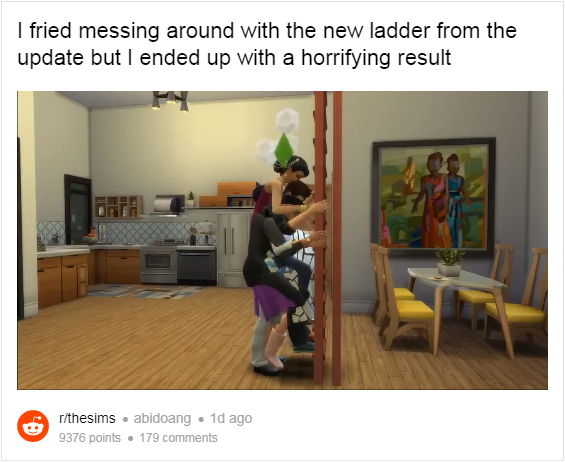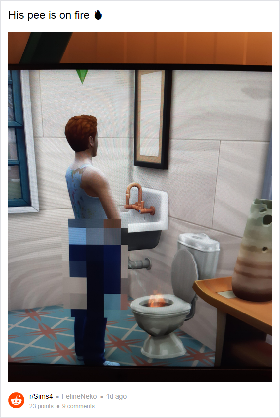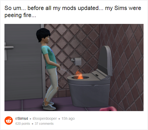 RockPaperShotgun 报道称,近日更新的《模拟人生 4》游戏补丁,意外地引入了爬梯和尿火等让人啼笑皆非的 bug 。作为即将到来的 Eco Lifestyle 扩展包的前戏,其带来了新的 NPC 和分享账单等改进。然而无聊的玩家们,还是乐此不彼地刷新着与“厕所纵火”等有关的 bug,比如 Reddit 网友分享的这些。