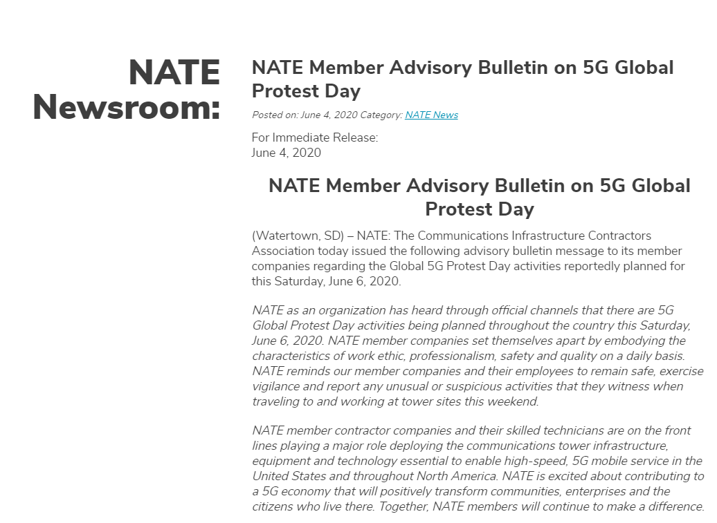 “NATE作为一个组织通过官方渠道得知,本周六全国各地都有5G全球抗议日活动,”NATE表示。“NATE提醒我们的会员企业及其员工在本周末前往基站现场和工作时,请保持安全,提高警惕,并报告任何不寻常或可疑的活动。”