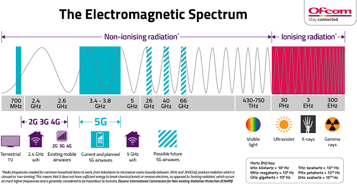 如上图所示,700MHz 是当前广播电视专属的频段。2G / 3G / 4G 使用了 2.4 ~ 2.6GHz 的无线频段,5G 使用了 3.4 ~ 3.8GHz 的更高频段,但这些低功率电磁辐射对人体的影响甚至不及可见光可紫外线。