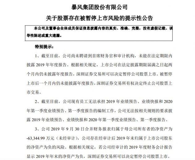 6月5日,暴风集团对外发布公告称,截至目前,公司尚未聘请到首席财务官和审计机构,未能在法定期限内披露2019年年度报告。根据相关规定,上市公司在法定披露期限届满之日起两个月内仍未披露年度报告,深交所可以决定暂停公司股票上市。