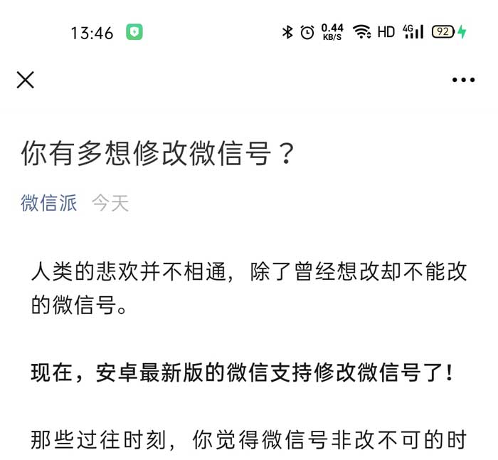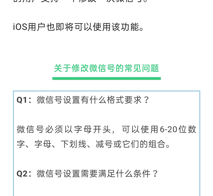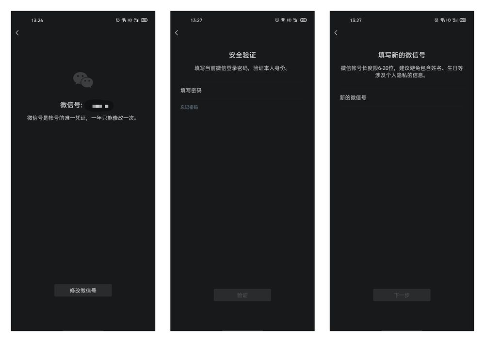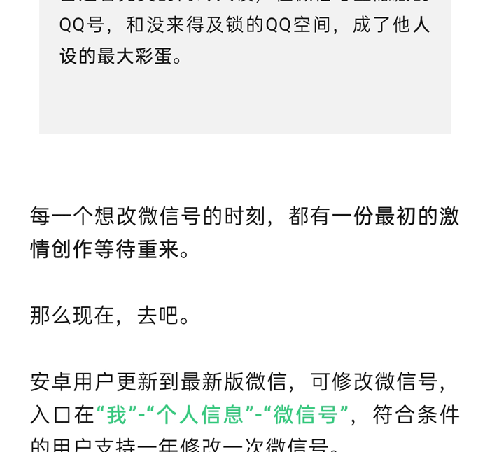今日,微信官方公众号“微信派”发文称,目前安卓最新版的微信支持修改微信号,符合条件的用户支持一年修改一次微信号。用户可在“我”-“个人信息”-“微信号”中修改。微信表示,修改后的微信号必须以字母开头,可以使用6- 20 位数字、字母、下划线、减号或它们的组合,并且账号在最近一年没有修改过微信号以及当前帐号无安全风险。