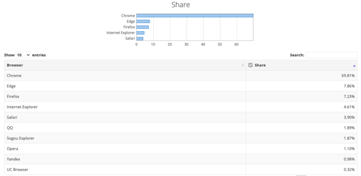 在 Google Chrome 之外,第二名是微软的 Edge 浏览器,占比 7.86%,第三名是 Firefox 占比 7.23%。