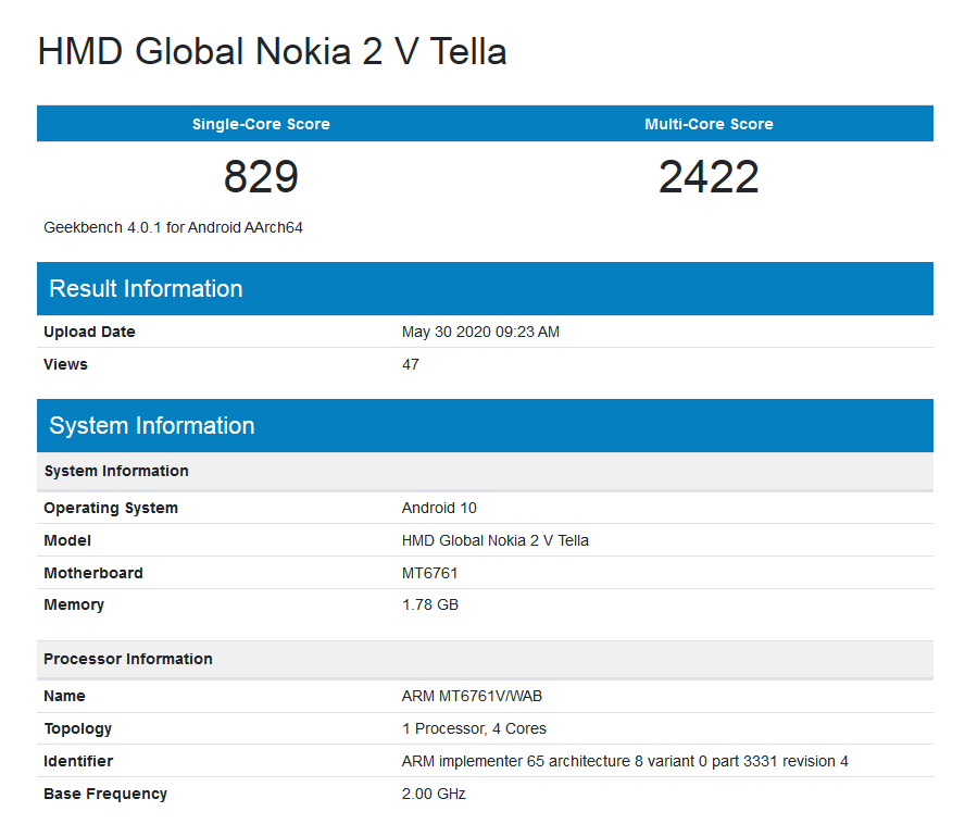 这款设备的全称叫做“HMD Global Nokia 2 V Tella”,其中这里的“V”代表着的是美国电信运营商 Verizon。根据跑分页面的规格参数显示该机搭载 2 GB的内存、联发科 MT6761 处理器(又名 Helio A22),运行Android 10 系统。