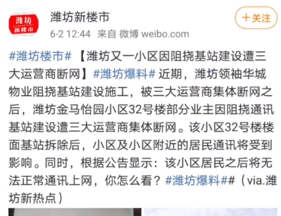 6月2日,小区物业称,通讯公司目前在拆除通讯基站,楼内用户未受到影响。有物业人员称,可以蹭其他小区的信号。