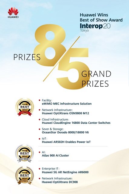 以下是华为 2020 东京 Interop 网络电信设备展的大奖明细: