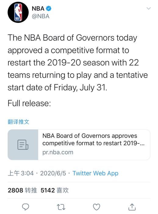 NBA官方4日发布通知,联盟董事会正式通过22支球队复赛的提议,2019-20赛季剩余赛事将于当地时间7月31日重启,22支球队将奔赴奥兰多角逐总冠军。参与复赛的球队暂居东西部前八名的队伍,以及尚有资格争夺季后赛名额的开拓者、鹈鹕、国王、马刺、太阳和奇才。