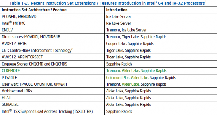 CLDEMOTE指令的支持范围很广,一个是Sapphire Rapids,也就是14nm Cooper Lake、10nm Ice Lake之后的再下一代数据中心至强,10nm工艺配新架构。