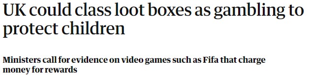 自从2017年《星球大战前线 2》中战利品箱所产生的负面效应爆发后,大家对游戏里战利品箱的担忧情绪也日渐上涨,DCMS 也于当年就这种开箱机制作为“沉浸式及令人成瘾技术调查”的一部分,采访了游戏行业的几位代表。同年9月,DCMS 就发出了“付费战利品箱应受《赌博法》约束”的建议,并呼吁禁止向儿童出售带有战利品箱要素的游戏。