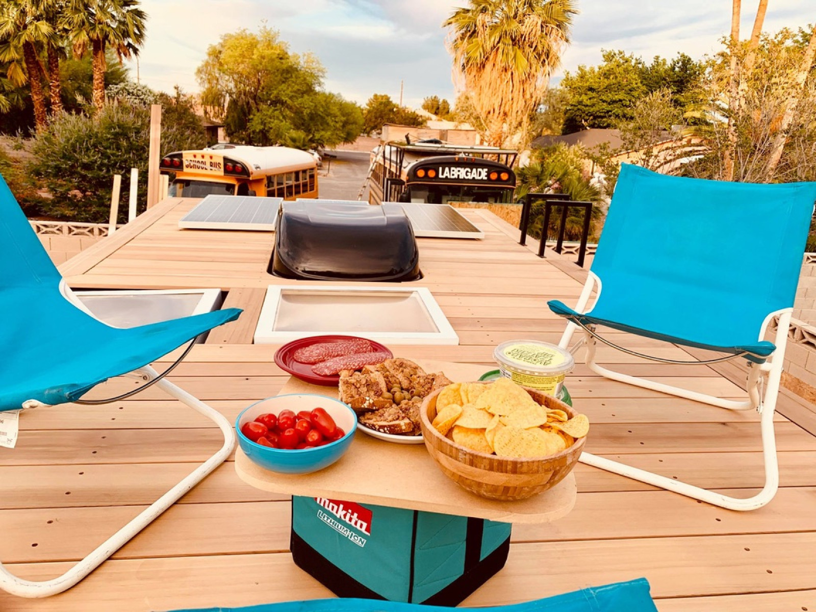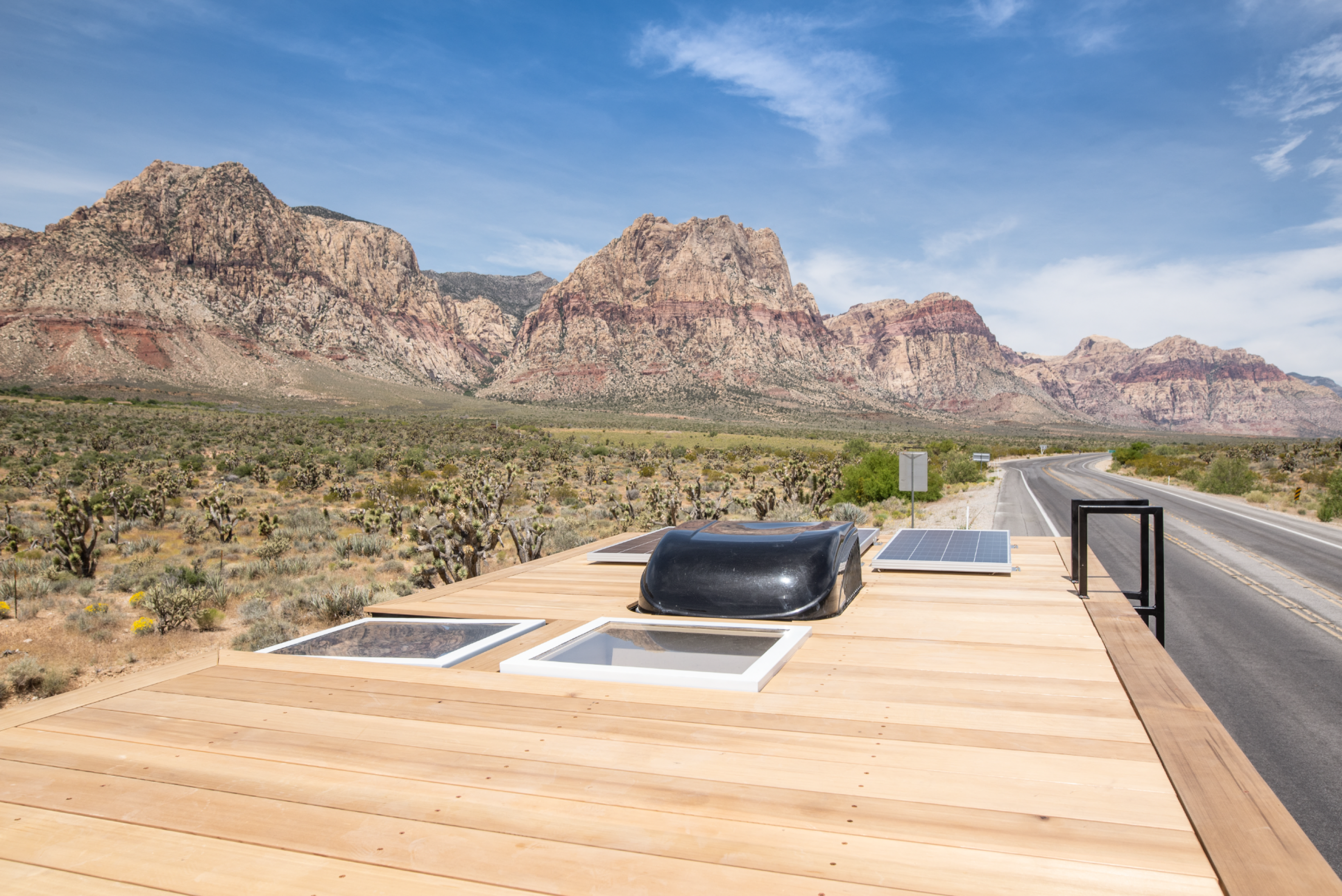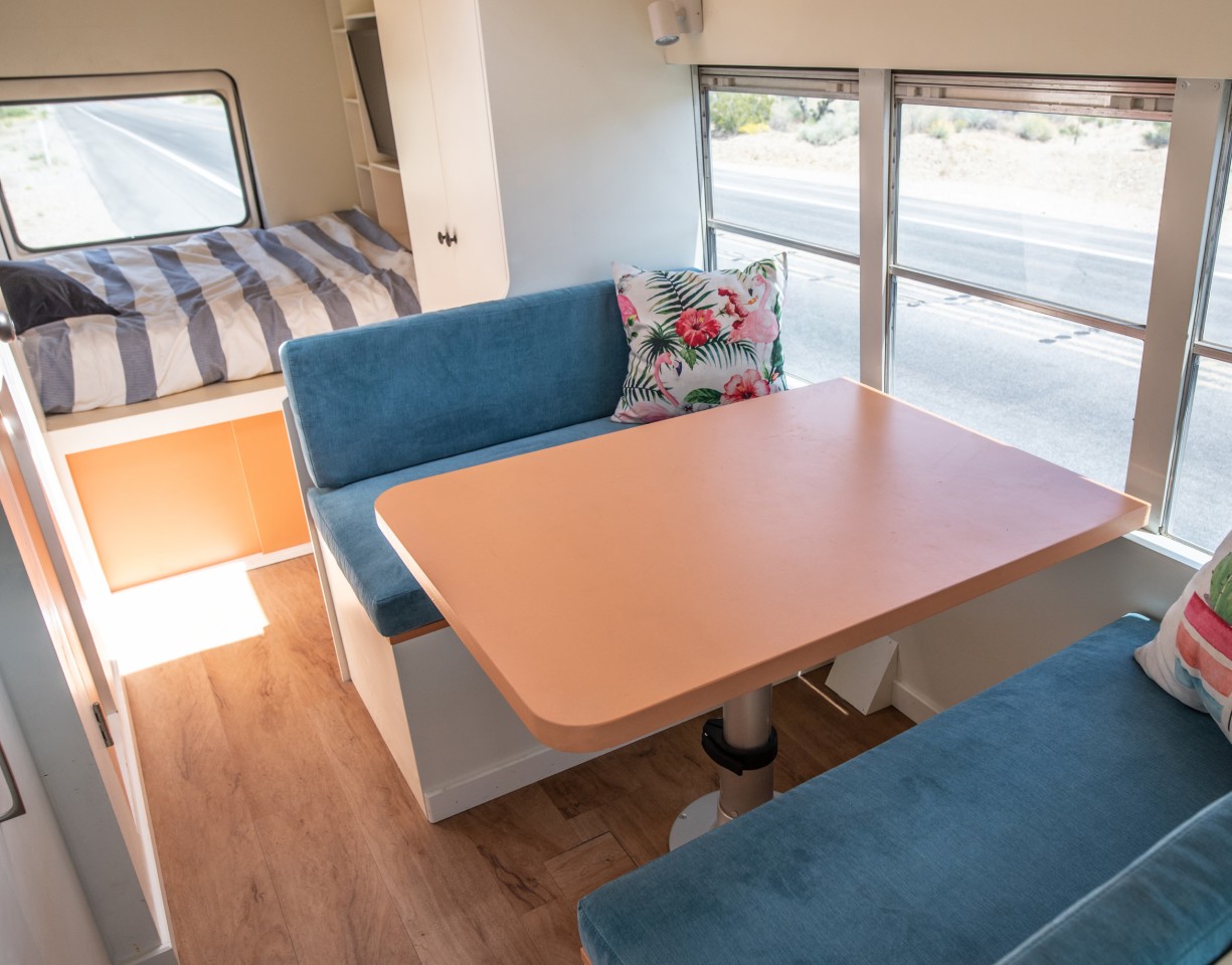要说起Leon最大的特色应该就是它宽敞的屋顶甲板。Mybushotel利用迷你巴士长而直的车顶线在车顶安装了全长度的木质甲板。虽然甲板的后半部分被太阳能电池板和空调所占,但前半部门还是为房车的两三位乘客提供了足够的空间来坐在或躺在阳光明媚的天空下。