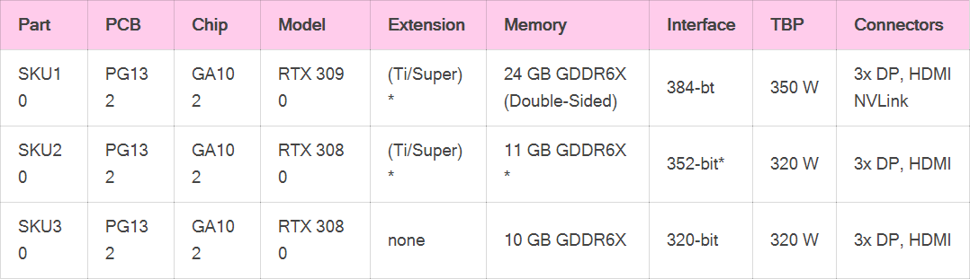 规格方面,三款卡都基于安培架构的GA102核心,搭配显存是新一代的GDDR6X,分别搭配384-bit 24GB、352-bit 11GB、320-bit 10GB,整卡功耗分别为350W、320W。320W,输出接口有三个DisplayPort、一个HDMI,RTX 3090还支持NVLink。