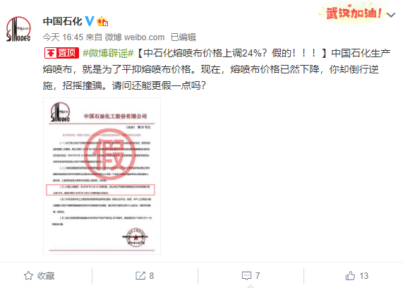 对此,中国石化官微表示:“中国石化生产熔喷布,就是为了平抑熔喷布价格。现在,熔喷布价格已然下降,你却倒行逆施,招摇撞骗。请问还能更假一点吗? ”