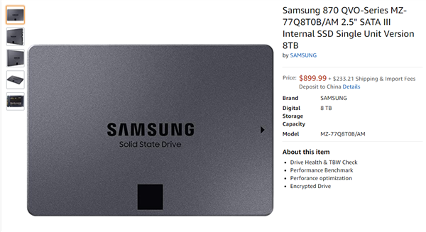 TLC是目前最普及的NAND闪存规格,不管大家是否接受,下一站就是QLC,产品也正在陆续增多。今天,美国亚马逊突然上架了三星870 QVO系列新品SSD,虽然没有明确标注,但从各方面就是QLC闪存了。三星870 QVO SSD是标准的2.5寸SATA规格,目前上架的是1TB、8TB两个容量版本,售价分别为899.99美元、129.99美元,约合人民币6400元、920元,未来肯定还会有2TB、4TB版本。