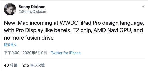 根据知名爆料者 Sonny Dickson 透露,苹果可能会在本月 22 日举行的虚拟 WWDC 上发布全新设计的 iMac。全新 iMac 外观类似 Pro Display XDR 显示器,同时会采用全 SSD 设计,停止使用机械硬盘。苹果还会在新款 iMac 上增加 T2 芯片。