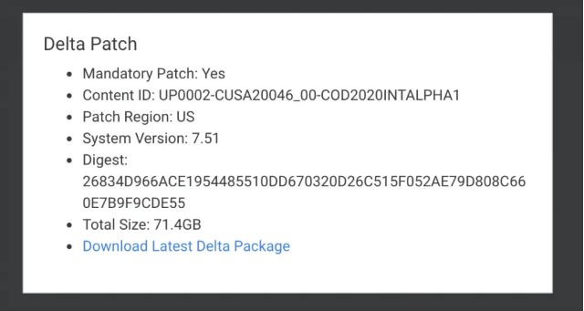 PS4网站PS4DataBase上传了一组名叫“红门”(The Red Door)的内部开发者阿尔法版《使命召唤2020》文件,这些文件大小71G,支持PS4 Pro。该信息表明,文件代码为COD2020INTALPHA,或与2020的《使命召唤》有关。另有数据挖掘者(不确切)表示,文件中引入了以下模式: