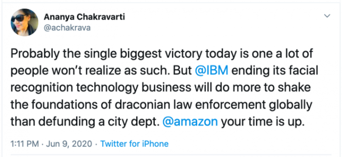 也许今天最大的胜利是很多人不会意识到的。但是,IBM 终止其面部识别技术业务,将比解散一个城市部门更能动摇全球严厉执法的基础。亚马逊,你的时间到了。