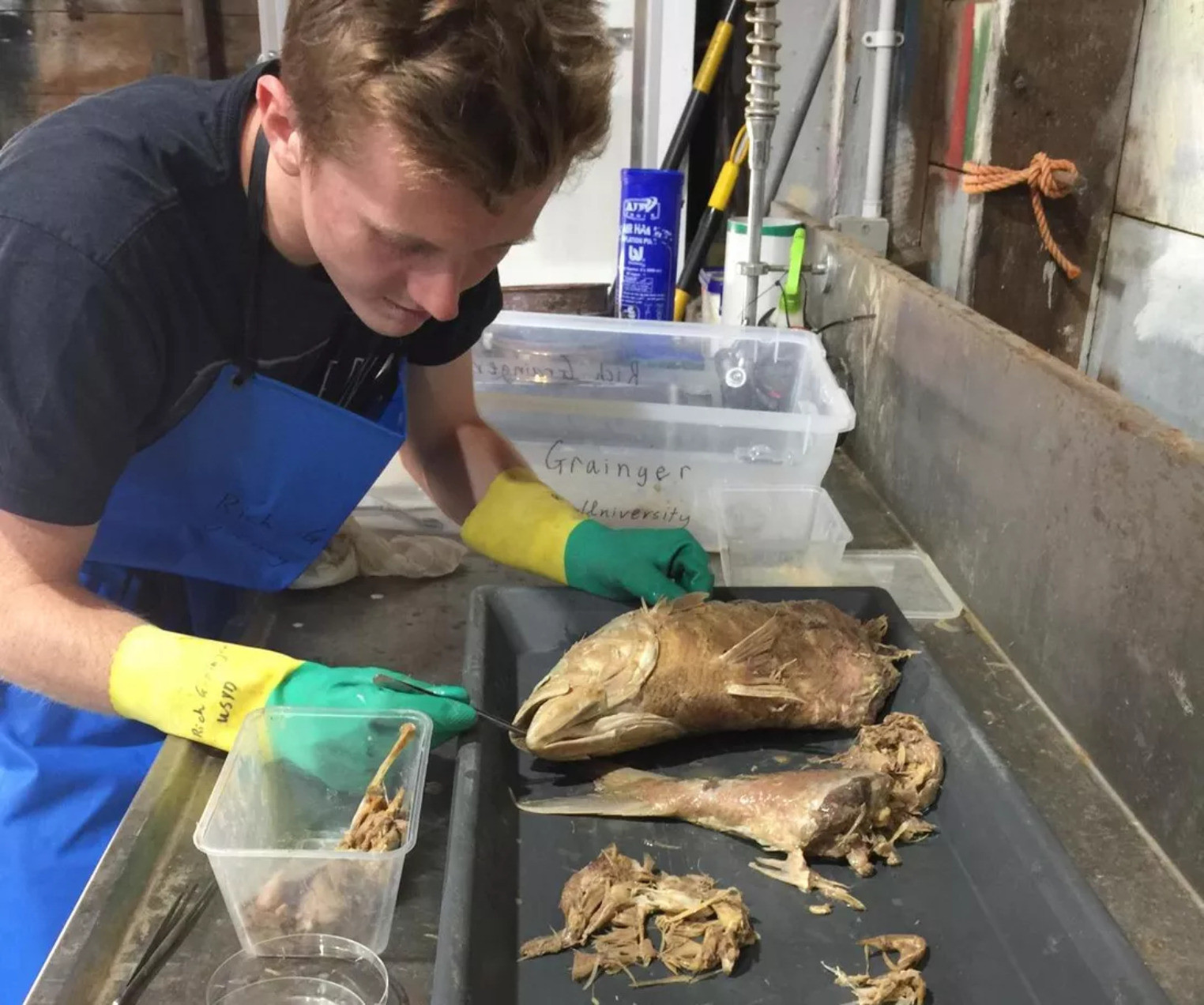 他是周日发表在《Frontiers in Marine Science》杂志上的一篇关于白鲨进食习惯研究的文章的首席作者。同日,悉尼大学还发布了一张展示对大白鲨胃内容物分析过程的照片。