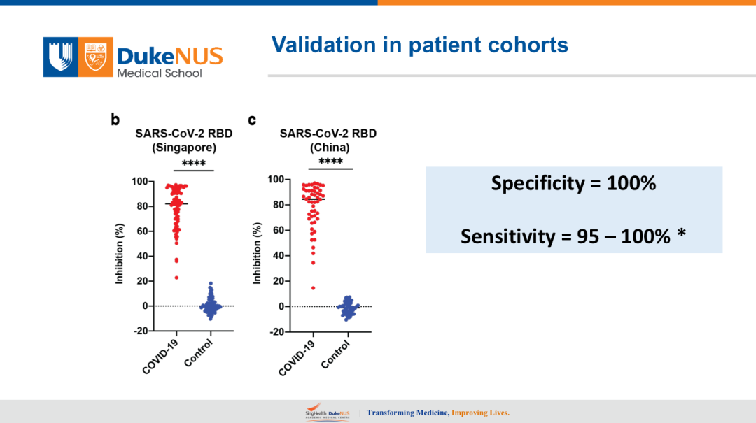 我们文章里面当然要分析大量人的数据(数据见上图)。在新加坡我们做了75个COVID-19,这73是PCR阳性,没有做过血清学,然后75个是阴性对照。在中国南京有一个合作单位给我们分析了50个病人,50个阴性对照,大家可以看出,假如你把Cut-off值放到20%到30%的话,基本上没有假阳性,假阴性估计1%到5%。假阴性怎么来的?PCR阳性很多病人当中不能产生足够的中和抗体。在所有的病毒里面,只要感染的人多到一定程度是会出现这种现象的,有些病人的B细胞不是很强,T细胞足够强,所以没有很高的中和抗体,在中和抗体实验中呈现出来是阴性。所以可以说这个方法检测特异性是100%,但是灵敏度在95%-100%。