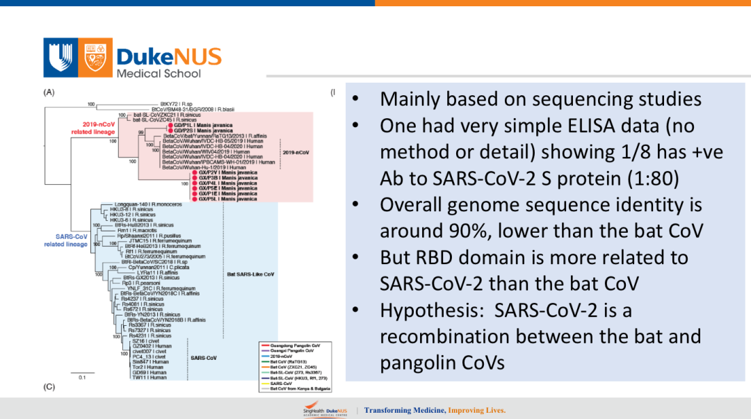 主要的论点就是图中这些红点就是从穿山甲来的类新冠病毒,和COVID-19有关的病毒。但是和人的,和石正丽老师发现的蝙蝠病毒来说,它们相对来说同源性要低一点,整体基因组的同源性在90%左右。很有意思的,很有意思的就是,他们关键的受体结合的位点即受体结合结构域反而同源性很高。我个人认为,我是比较注重血清学的,我个人认为这两篇文章的弱点就在于它们都做了分子的鉴定、病毒的分离,但是血清学,华南农大的文章有一点就是没有做中和实验,港大就没有血清学,我认为血清学在这个领域还要加强。