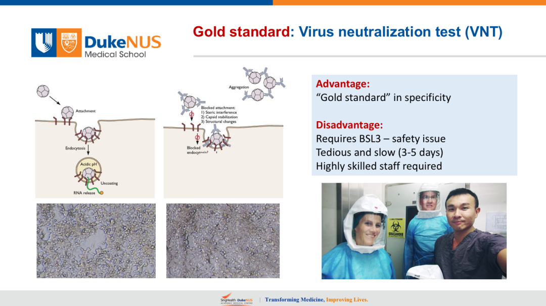 中和实验是这样来的,上图左上是病毒来了,病毒和受体ACE2结合,通过不同的构象变化也好内吞作用也好,最后进到细胞里面了,然后开始感染,然后致病。我们在做血清中和实验的时候,就把抗体先跟病毒孵育,然后把复合物放到细胞表面,假如用中和抗体的话,肯定可以阻断和受体的结合。中和抗体还可以阻断其他的部位,但是多数就是第一步,不让它跟受体结合。优点刚才已经说了,是金标准,没有其他方法能够跟它比,因为它是最最自然的方法,来检测中和抗体。但是有很多缺点,我刚才已经讲了。还有一点是要求非常高的P3实验室,还要求非常有经验的,一般不经常在实验室工作的人,这两个图片(上图下)给你看的话很难看出来,左边是阴性的没有中和抗体,右边是阳性有中和抗体。这本身是非常艰巨的工作。