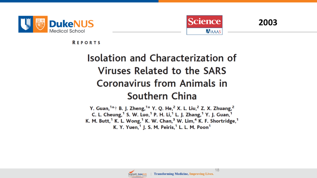 谈到起源的问题。我想回顾一下当时SARS时候关于动物起源的研究,它和新冠有点不一样,当时SARS暴发以后,港大管轶他们组马上去了广东,不同的活体动物市场,野生动物市场去采了很多样。SARS在2002年11月开始暴发,2003年3、4月份达到高潮,4、5月份时管轶就去了那里采样。