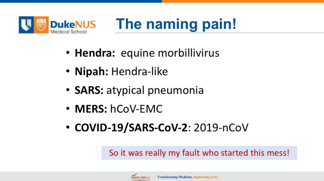 上图这里讲到动物命名,我们在柳叶刀的文章也提到。好像现在新发传染病,尤其是蝙蝠里面来的病毒,命名总是不能一次到位。在澳大利亚的时候,这个病毒首先出现的我们叫它马的麻疹病毒,麻疹病毒是一个病毒属,它是类似于麻疹病毒,所以叫做马的麻疹病毒。后来我做了全基因序列以后,我觉得它肯定不是麻疹病毒,所以我把它改成亨德拉病毒,在马来西亚它第一次发现的时候,是马来西亚和美国CDC合作,因为它和Hendra最为接近,所以就叫类亨德拉病毒。一位马来西亚华人教授,他发现这个病毒不满意,他觉得是澳大利亚,他觉得要有一个马来西亚的名字就叫了尼帕病毒。我们知道SARS刚上来的时候叫非典,后来世界卫生组织把它叫做SARS。MERS一开始就叫人的冠状病毒,后来荷兰的EMC把它改成MER病毒。这次更糟糕了,首先叫它COVID-19-nCoV,现在出了两个名字,疾病叫COVID-19,病毒就叫SARS-CoV-2。所以有的时候开玩笑说,也许是我的错,我是第一个改名的人,马的麻疹病毒改成亨德拉,从此以后好像这个传统就没有变过,每次发现一个病毒我们都要重新命名,这也是很糟糕的。