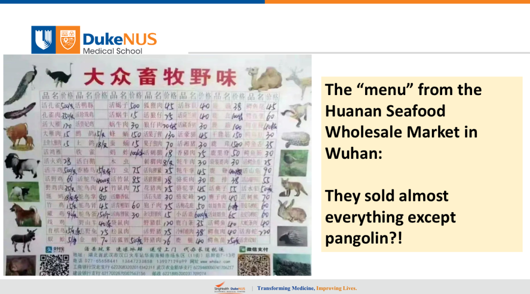 上图网上传的比较多的,在武汉海鲜批发市场的价目表,很有意思,大家现在都认为穿山甲是头号怀疑对象。看一下当时市场的价目表里倒是没有穿山甲。当年SARS的时候,果子狸起了很大作用,在这个市场上活的果子狸在卖,果子狸肉也有卖。接下来的工作里面,穿山甲肯定要做,但是还有很多其他野生动物,包括果子狸肯定不能放弃,尤其是血清学调查,我觉得可以做大规模的调查。
