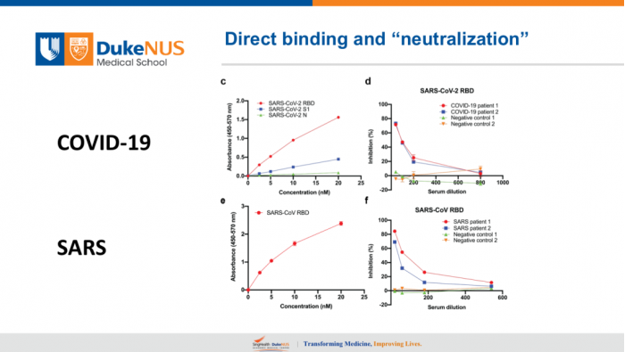 很重要的一点,新冠和SARS很接近,它们用同一个细胞受体ACE2。马上重复这个实验,用SARS的RBD,也是用HRP偶联以后这两个曲线差不多的(左下),SARS的RBD也是非常漂亮,我们用SARS血清,除了中国以外新加坡是亚洲病人比较多的一个国家,在东南亚,我们现在还有当时SARS存活下来的人,采血发现还是有中和抗体。SARS也是这样,它的中和效果有的到85%,健康人对照里面没有中和(右下)。