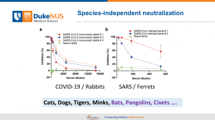 为了表明这个可以用来做动物的实验,我们不做任何修改,左边是COVID-19,用兔RBD做的免疫,然后结果表明1、2、3仍然有中和作用,阴性对照没有中和。右边是17年前在澳大利亚用雪貂做的实验,这是感染SARS产生的血清1、2,用SARS中和实验来做,也是非常漂亮。