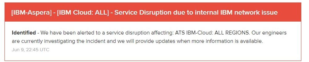 在宕机事件发生之后,IBM Cloud 官方推特并没有更新推文,不过外媒发现了一个托管在第三方服务器上的IBM Aspera 的状态页面,这似乎证实了这很可能是一个全球性的网络问题。