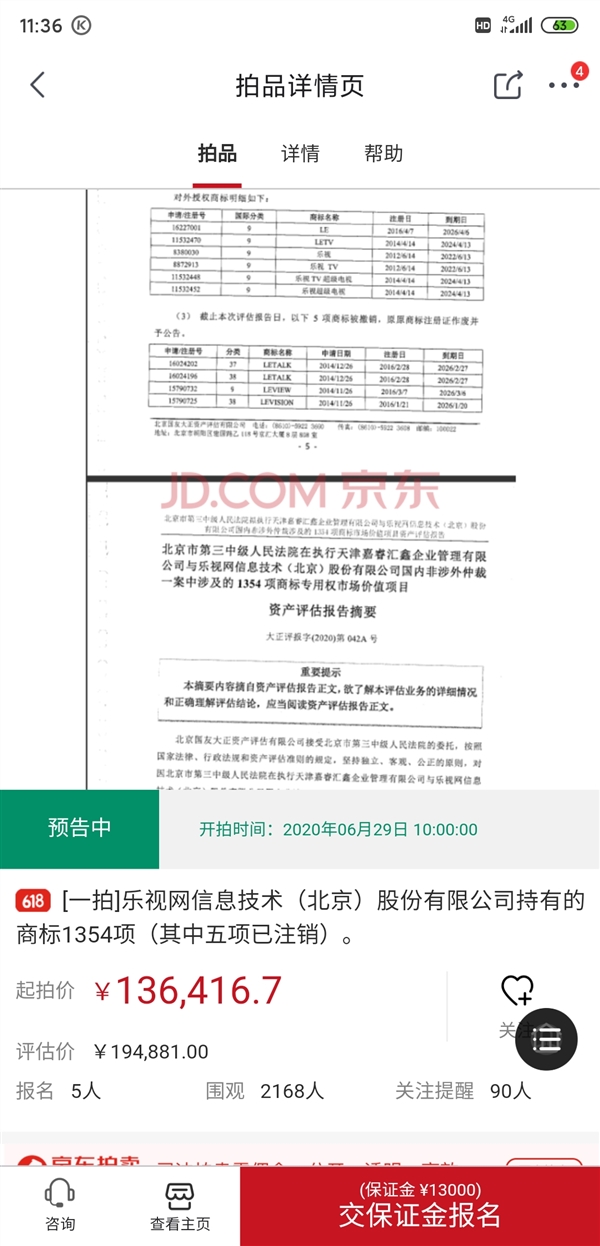 据悉,该拍卖是由北京市第三中级人民法院发起,所拍卖的乐视网持有的1354项商标(其中五项已注销)起拍价格为136416.7元。根据法院方面提供的相关评估报告显示,这些商标评估价格为194881元。从商标清单中可以看到,这些拍卖商标中,包括众人耳熟能详的乐视产品,包括“乐视”、“乐视TV”、“乐视PAD”等商标名称,覆盖范围也较广。