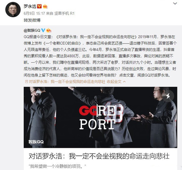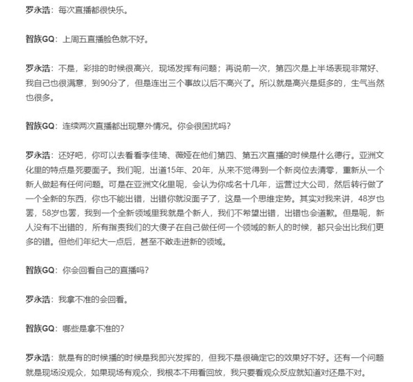 另外,在采访中,罗永浩谈到了自己的直播现状。罗永浩表示,每次直播都很快乐,虽然连续两次直播都出现了意外情况,但自己也不会很困扰,因为“新人没有不错的”。对于自己“拿不准的”直播表现,自己会回看直播。接下来罗永浩还会将直播电商做“技术升级”,与其他网红带货形成差异。