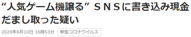 近日由于疫情的原因导致任天堂Switch再次陷入缺货危机,于是各种歪门事件频发,6月10日今天据NHK报道,警视厅(东京)抓获了一名打着卖Switch幌子收钱不发货的骗子。