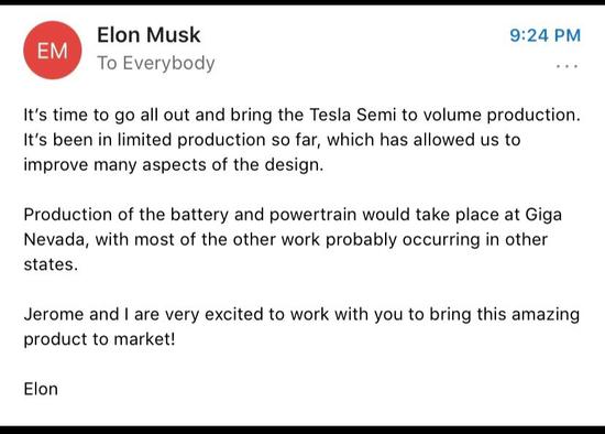 特斯拉CEO埃隆·马斯克(Elon Musk)今日在一封内部电子邮件中称,特斯拉半挂式电动卡车“Semi”即将量产。马斯克在邮件中称,在疫情导致的工厂短暂停产后,特斯拉正在加大汽车产量。如今,是时候开始量产“Semi”半挂式电动卡车了。
