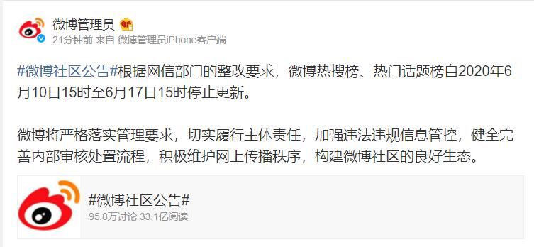 6月10日消息,针对“网信办约谈新浪微博,微博热搜停更一事”,新浪微博官方做出回应,微博热搜榜、热门话题榜自2020年6月10日15时至6月17日15时停止更新。新浪微博将严格落实管理要求,切实履行主体责任,加强违法违规信息管控,健全完善内部审核处置流程,积极维护网上传播秩序,构建微博社区的良好生态。